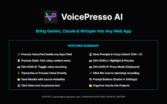 VoicePresso AI Writing Assistant, yazılı içerik üretimini kolaylaştıran bir tarayıcı uzantısıdır. Sesli komutlarla metin yazma, anında AI işleme ve metin yönetimi özellikleri sunar. Kullanıcılar, sesli transkripsiyon ile metin alanlarına yazı girebilir veya doğrudan sesli komut vererek sonuç alabilirler. Farklı dil seçenekleriyle, 25'ten fazla dilde destek sağlar. Ayrıca, yazım hatalarını düzeltme, e-posta taslağı oluşturma ve içerik yeniden yazma gibi çeşitli kullanım senaryolarına olanak tanır.
